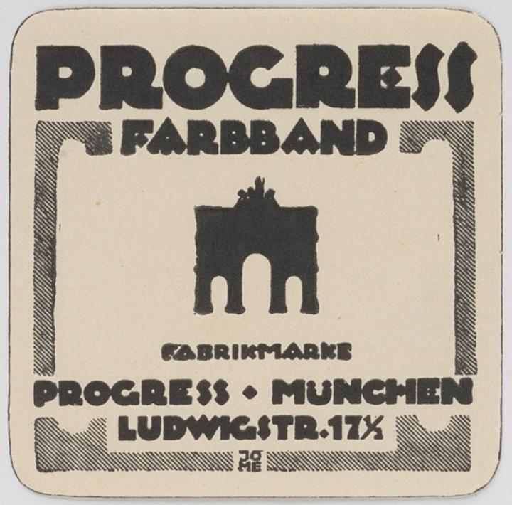 Siegelmarke für Farbband Progress rechteckig, monochrom Text: Fabrikmarke Progress. München Ludwigstr. 17 1/2 Grafik: JOME, zwei Exemplare