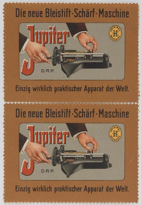 Zwei Werbemarken (zusammenhängend) für Schreibzubehör Jupiter rechteckig, polychrom Text: Einzig wirklich praktischer Apparat der Welt