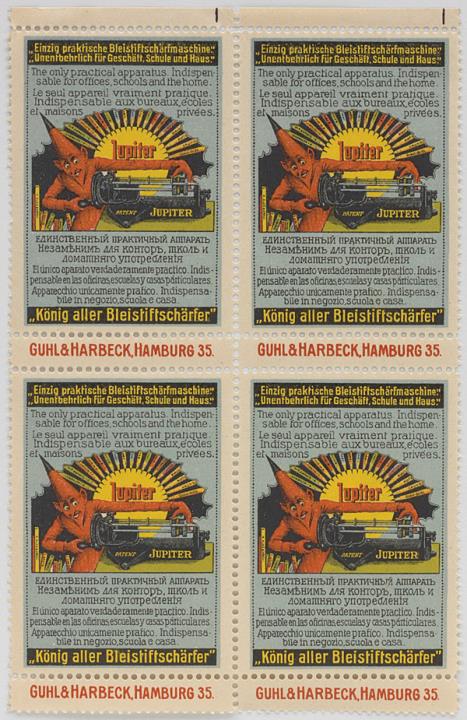 Vier Werbemarken (zusammenhängend) für Schreibzubehör Jupiter rechteckig, polychrom Text (sechssprachig): Einzig praktische Bleistiftschärfmaschine. Unentbehrlich für Geschäft, Schule und Haus