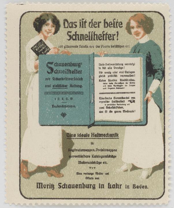 Reklamemarke/Werbemarke für Bürobedarf rechteckig, polychrom Text: [...] Moritz Schauenburg in Lahr in Baden