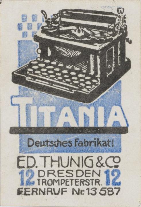 Reklamemarke/Werbemarke für Schreibmaschine Titania; rechteckig, polychrom Text: Ed. Thunig & Co. Dresden Trompeterstr. 12