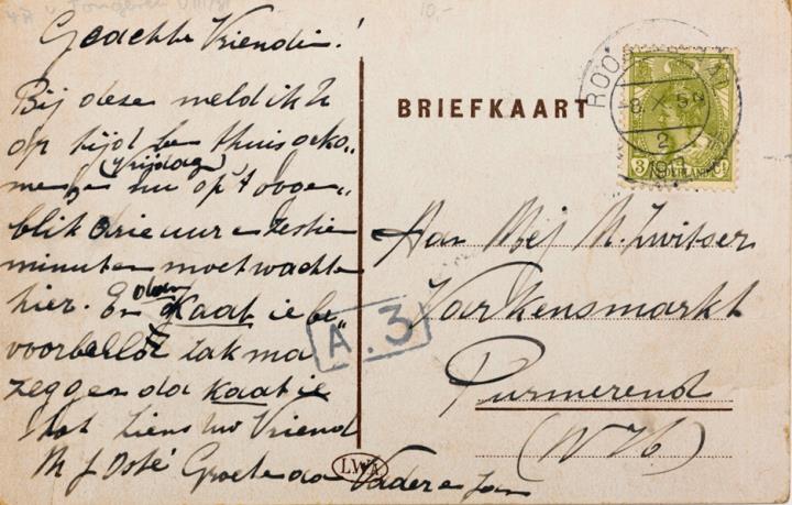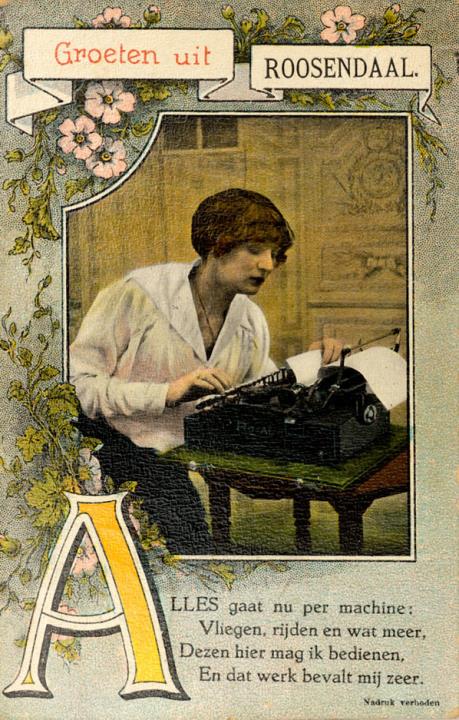 Illustrierte Postkarte; Grafik, polychrom Rückseite: Frau mit Schreibmaschine, dekorativer Rahmen und Gedicht Vorderseite: beschrieben; adressiert an Mej Zwitser(?), Purmerend; Briefmarke Nederland 3 ct.; Poststempel Roosendaal/8.X.5 1917