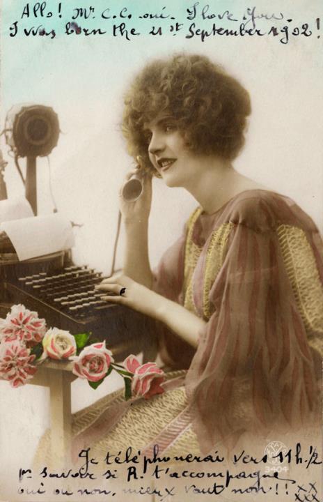 Illustrierte Postkarte; Fotografie, koloriert; Serie A. Noyer 3404 Rückseite: Frau mit Schreibmaschine und Telefon; beschrieben Vorderseite beschrieben
