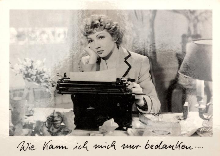 Illustrierte Postkarte; Fotografie, monochrom Filmhistorisches Bildarchiv Peter W. Engelmeier S 19 Rückseite: Standfoto aus einem Film; Schauspielerin mit Schreibmaschine Vorderseite nicht beschrieben