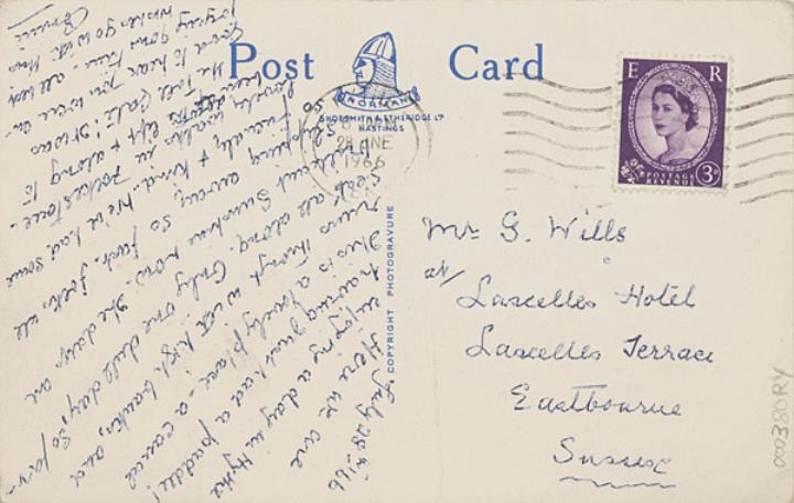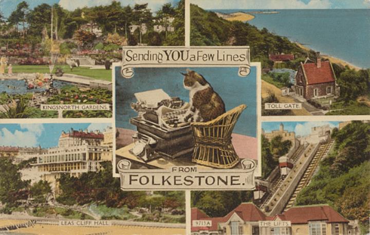 Illustrierte Postkarte; Fotocollage, koloriert Rückseite: Katze mit Schreibmaschine, vier Ansichten von Folkestone Vorderseite: beschrieben; adressiert an Mr. Wills, Eastbourne; Briefmarke Postage Revenue (U.K.) 3 D; Poststempel Hathe/28 Jne 1966