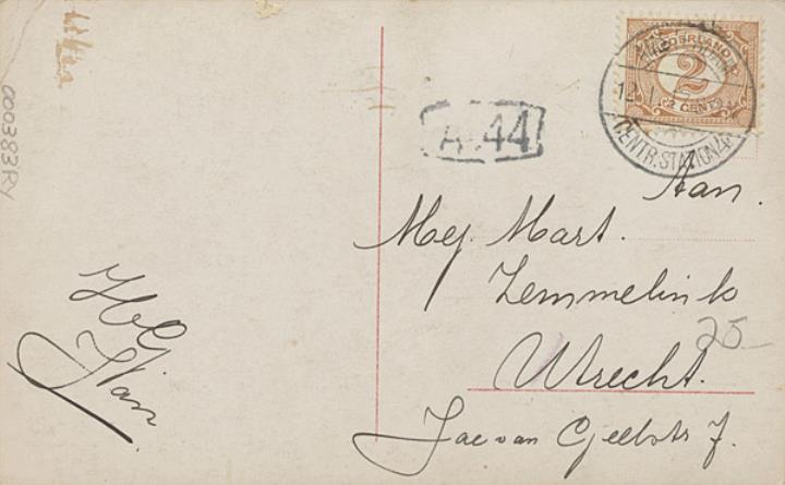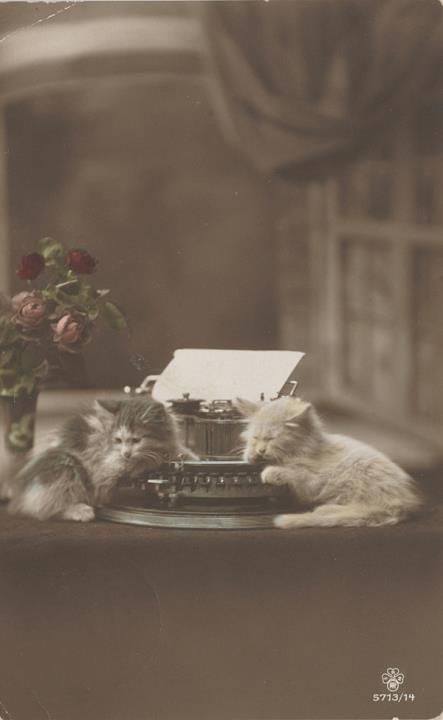 Illustrierte Postkarte; Fotografie, koloriert; Serie RPH 5713/14 Rückseite: zwei Katzen mit Schreibmaschine, Blumen als Dekoration Vorderseite: beschrieben; adressiert an Mej Jart, Utrecht; Briefmarke Nederland 2 Cent; Poststempel Amsterdam/12.I.1917