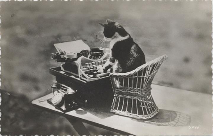 Illustrierte Postkarte; Fotografie, monochrom; Nr. O.11221 Rückseite: Katze mit Schreibmaschine Vorderseite nicht beschrieben
