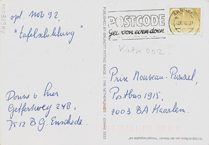 Illustrierte Postkarte; Fotografie, monochrom Rückseite: Katze mit Schreibmaschine Vorderseite: beschrieben, adressiert; Briefmarke Nederland 60 c; Poststempel Arnhem/2.XI.1992