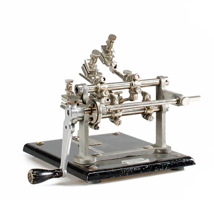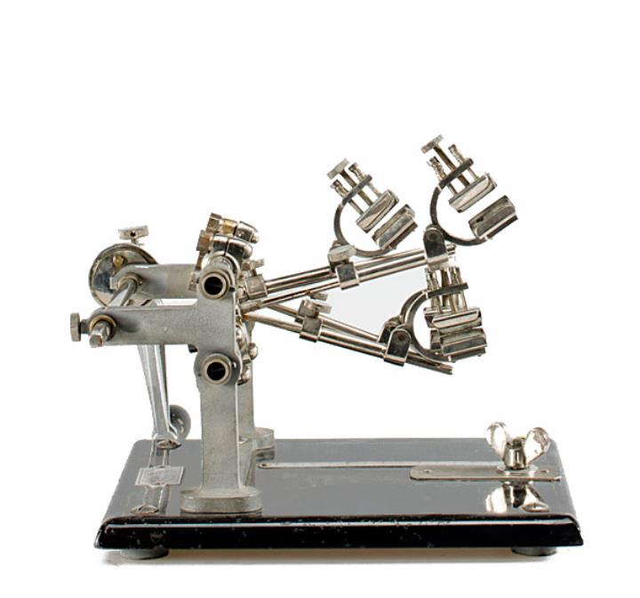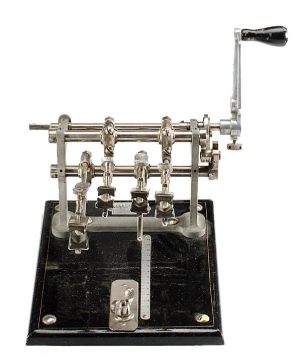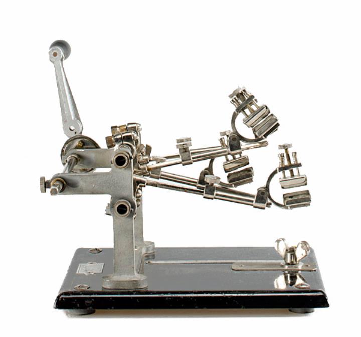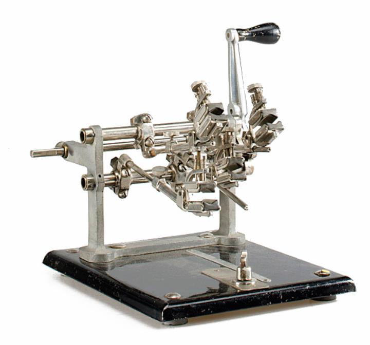 Fingerübungsapparat Ochydactyl Musiker und Typisten trainierten damit die Beweglichkeit und Spreizung der Finger; am Sockel konnte ein Handgelenkshalter montiert werden Konstrukteur: Georges Retif, Seriennummer 301