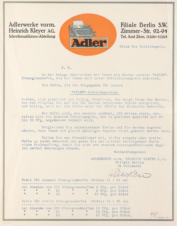 Begleitbrief der Adlerwerke vorm. Heinrich Kleyer A.G., Berlin zu einem Muster der Adler-Stenogrammhefte Maschinenschrift, unterschrieben Werbebild: Lucian Bernhard