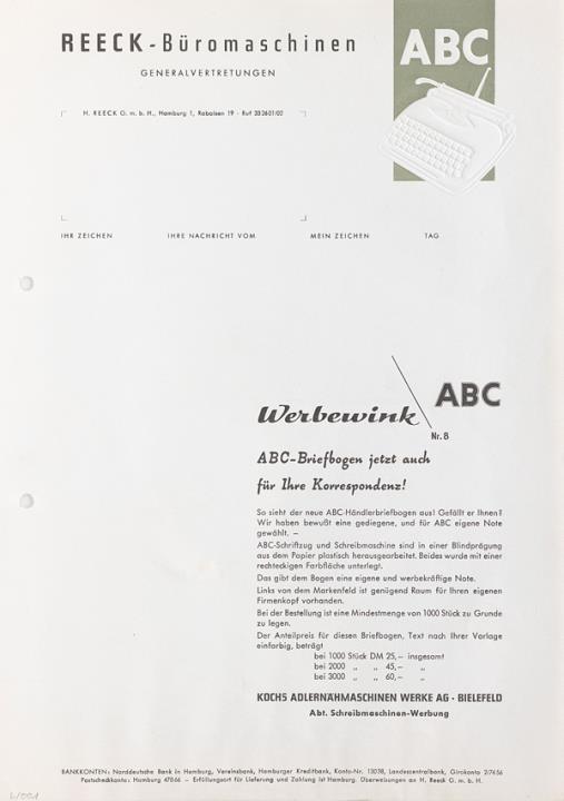 Briefbogen-Muster der Schreibmaschinenhandlung Reek Büromaschinen GmbH, Hamburg ABC Werbewink Nr. 8 nicht beschrieben
