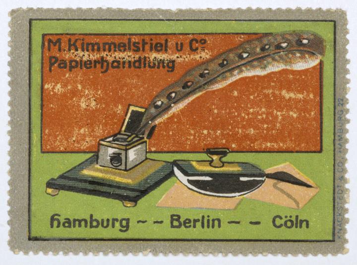 Siegelmarke für Papierhandlung Kimmelstiel rechteckig, polychrom; Druck: Knackstedt & Co. Hamburg