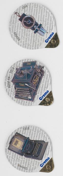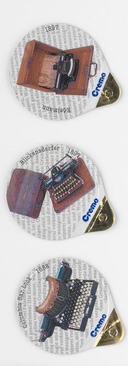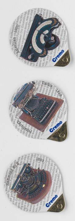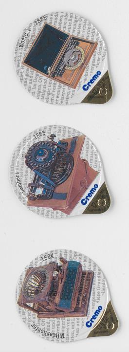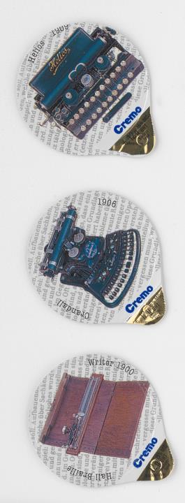 Konvolut aus 17 Kaffeerahmdeckeln einer Serie (Cremo); rund mit Lasche, polychrom Motive: Mitterhofer 1864, Lambert 1883, World I 1886, Columbia Bar-Lock 1888, Blickensderfer 1897, Edelmann 1897, Hammond 1898, Pittsburgh Visible 1898, American 1900, Hall Braille 1900, Crandall 1906, Helios 1909, Corona 1912, Ideal A4 1913, Virotyp 1914, Underwood 1915, Mignon AEG 1920