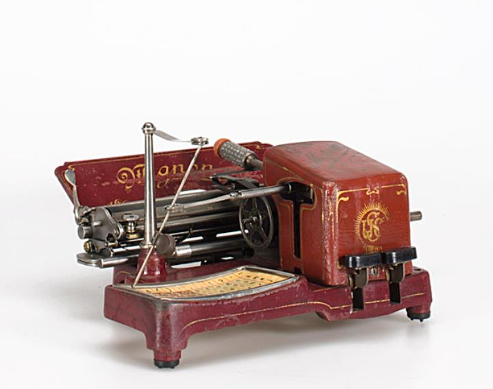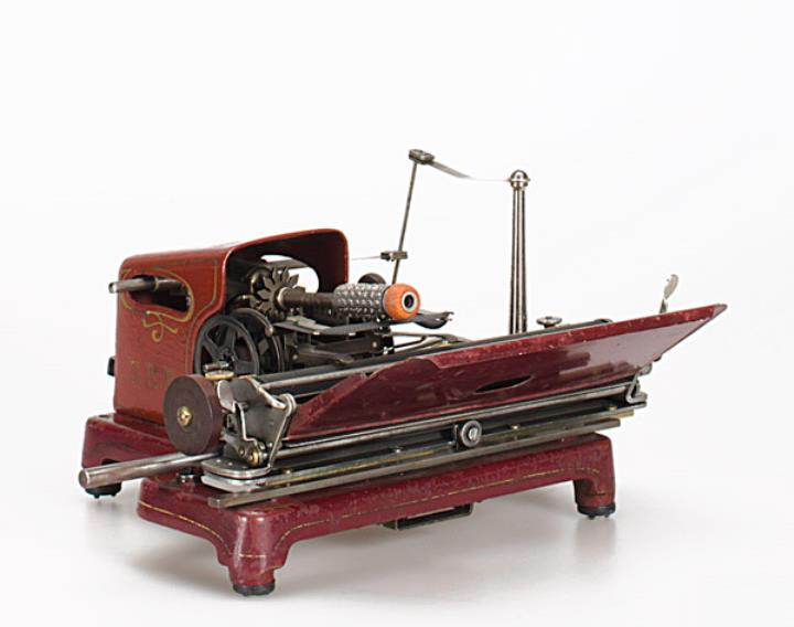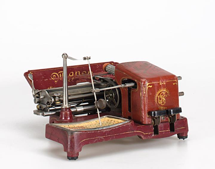 Schreibmaschine Mignon Modell 2 (rot, zwei Nuancen) Eigenschaften: Zeiger, Typenzylinder, Oberanschlag, Farbband, Zeichenfeld Konstrukteur: Friedrich von Hefner-Alteneck Besonderheit: austauschbarer Typenträger; Vorgänger der Mignon 2 in schwarz, Seriennummer 3730