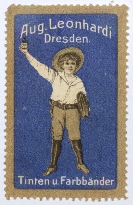 Reklamemarke/Werbemarke für Schreibwarenhersteller Leonhardi, Dresden rechteckig, polychrom (kobaltblau)