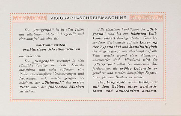 Prospekt für Schreibmaschine Visigraph, zwei Exemplare (eines fotokopiert, gebunden)