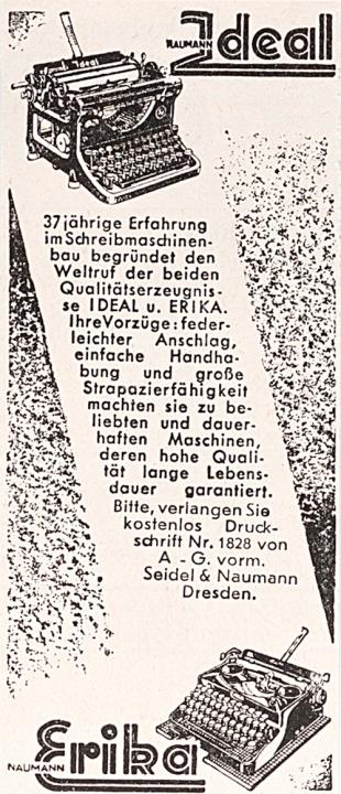 Werbeanzeige für Schreibmaschinen Erika und Ideal monochrom