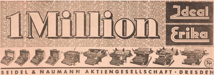 Werbeanzeige für Schreibmaschinen Erika und Ideal polychrom
