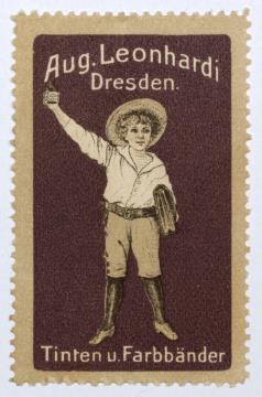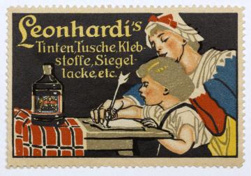 Reklamemarke/Werbemarke für Schreibwarenhersteller Leonhardi; rechteckig, polychrom weiterer Text: Chemische Fabriken für Tinten, Tusche, Klebstoffe, Siegellacke, etc.