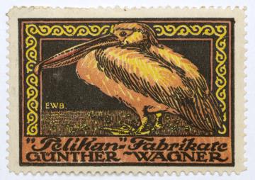 Reklamemarke/Werbemarke für Schreibwarenhersteller G. Wagner (Pelikan); rechteckig, polychrom weiterer Text: Schutzmarke Pelikan