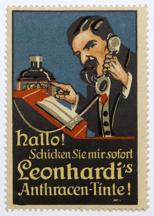 Reklamemarke/Werbemarke für Schreibwarenhersteller Leonhardi; rechteckig, polychrom