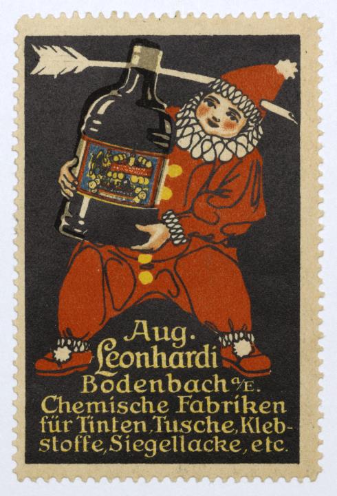 Reklamemarke/Werbemarke für Schreibwarenhersteller Leonhardi; rechteckig, polychrom weiterer Text: Chemische Fabriken für Tinten, Tusche, Klebstoffe, Siegellacke, etc.