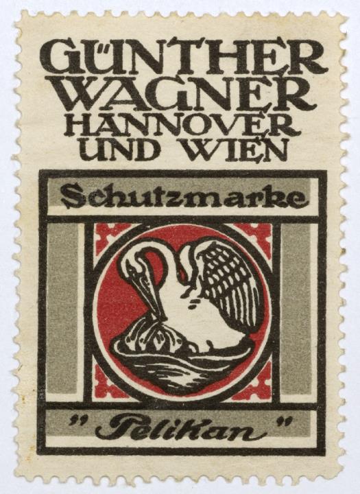 Reklamemarke/Werbemarke für Schreibwarenhersteller G. Wagner (Pelikan); rechteckig, polychrom weiterer Text: Schutzmarke Pelikan