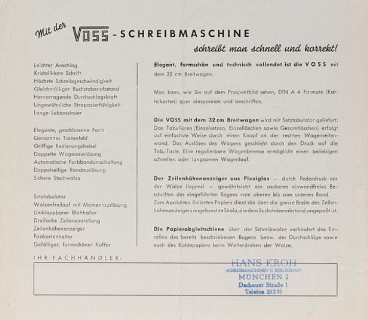 Prospekt für Schreibmaschine Voss mit dem 32 cm Breitwagen
