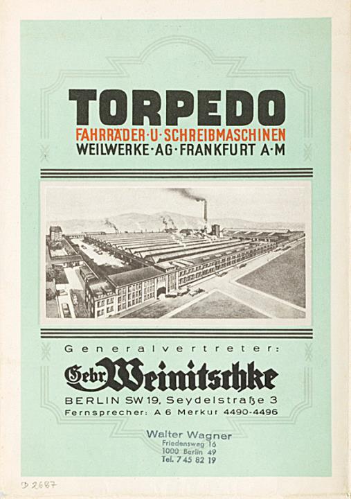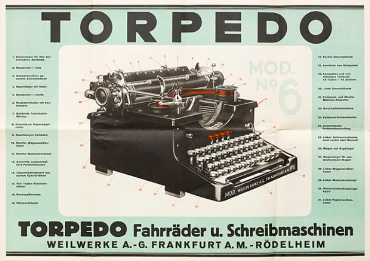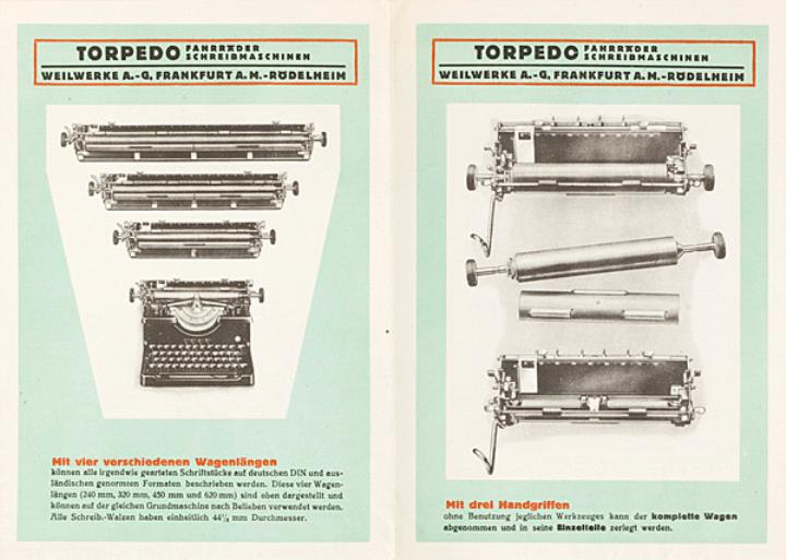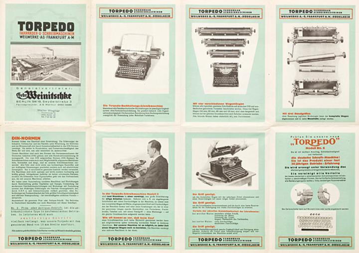 Faltprospekt für Schreibmaschine Torpedo im Innenteil großformatige Darstellung der Torpedo Modell 6