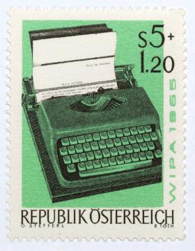 Briefmarke Republik Österreich; aus Serie zur Internationalen Briefmarkenausstellung WIPA 1965 rechteckig, polychrom, ungestempelt Wert: s5+1.20; Motiv: Schreibmaschine