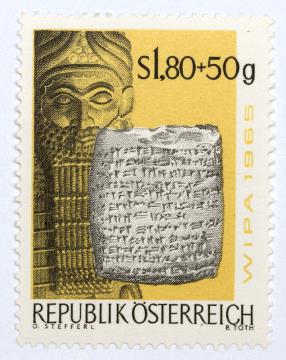 Briefmarke Republik Österreich; aus Serie zur Internationalen Briefmarkenausstellung WIPA 1965 rechteckig, polychrom, ungestempelt Wert: s1.80+50g; Motiv: Keilschrift