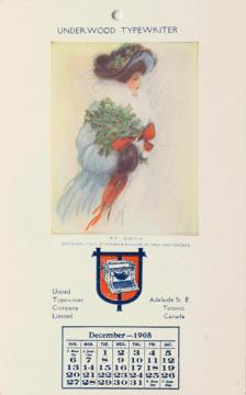 Illustrierte Postkarte mit Kalender; Grafik, polychrom; Rückseite: Frau in Winterkleidung mit kleinem Weihnachtsbaum, darunter Kalender "December 1908"; Vorderseite nicht beschrieben