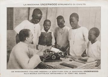 Werbepostkarte; Fotografie, monochrom; Rückseite mit Beschreibungstext: Ein Missionar lehrt Kindern im Sudan das Maschineschreiben mit der Schreibmaschine Underwood (frei übersetzt) Vorderseite: adressiert an Cav. Montefusti, Benevent; Briefmarke Poste Italiane 20 cent.; Poststempel Benevento/27.6.1933