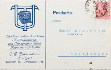 Postkarte mit Werbebild; Grafik, monochrom; Vorderseite: Schreibmaschine Underwood, Anschrift Firma Lamparter G.m.b.H., Reutlingen; Briefmarke Deutsches Reich 10 Pf.; Poststempel 16 Jul 19(8) Rückseite beschrieben (Maschinenschrift), datiert 16. Juli 1919