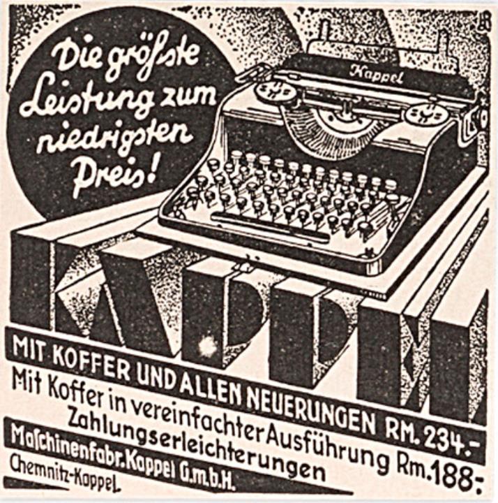 Werbeanzeige für Schreibmaschine Kappel monochrom