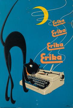 Werbeschild; Aufsteller aus Pappkarton für Schreibmaschine Erika Nr. III/9/31 Ag10-1727-56 polychrom; Grafik: Hahn. Dresden