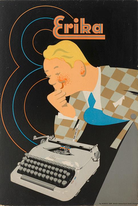 Werbeschild; Aufsteller aus Pappkarton für Schreibmaschine Erika Nr. Ag 49/059/57 DDR III/9/31 polychrom, zwei Exemplare