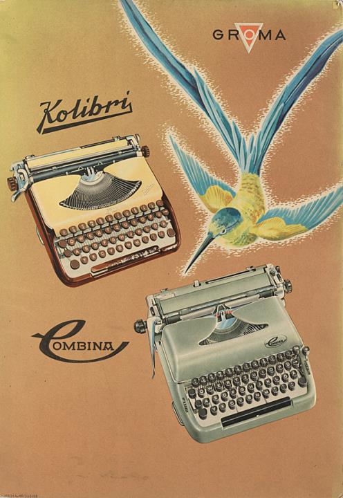 Werbeschild; Aufsteller aus Pappkarton für Schreibmaschinen Groma Kolibri und Groma Combina Nr. III9/31An49/365/58 polychrom, zwei Exemplare