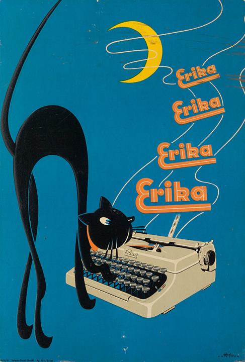 Werbeschild; Aufsteller aus Pappkarton für Schreibmaschine Erika Nr. III/9/31 Ag10-1727-56 polychrom; Grafik: Hahn. Dresden, zwei Exemplare (orange Version, gelbe Version)