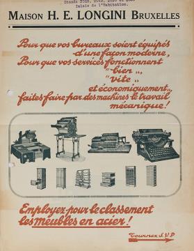 Faltprospekt der Büromaschinenhandlung H. E. Longini für Büromöbel und -maschinen, darunter Addressograph, Kopiermaschine Victoria, Rechenmaschine Triumphator und Schreibmaschine Woodstock