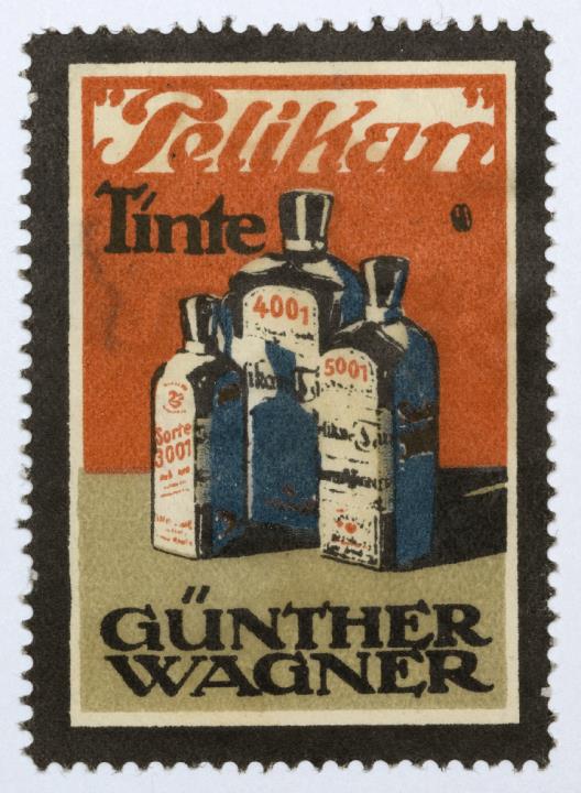 Reklamemarke/Werbemarke für Schreibwaren Pelikan rechteckig, polychrom