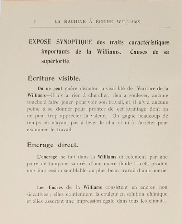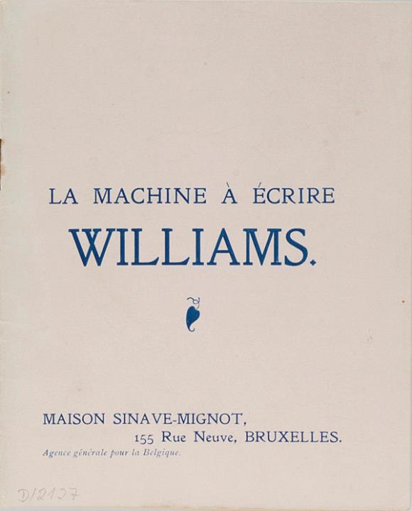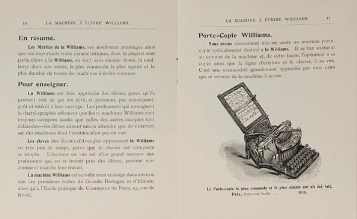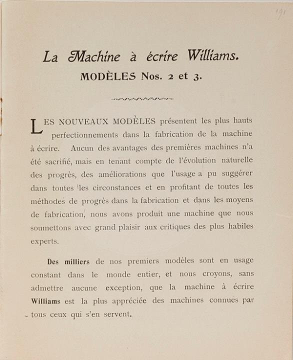 Prospekt in französischer Sprache für Schreibmaschine Williams, mit Tastaturenverzeichnis und Reklame für Bürozubehör