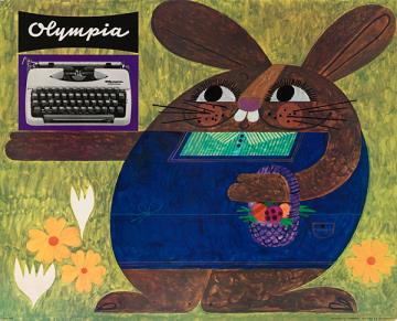 Werbeschild; Aufsteller aus Pappkarton für Schreibmaschine Olympia Splendid 66, mit Ostermotiv Nr. WLS 1027 polychrom