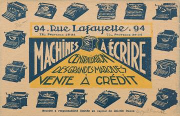 Antwortpostkarte; Grafik, polychrom Werbekarte: Schreibmaschinen verschiedener Hersteller / Werbung für Schreibmaschine Underwood, Corona und Remington Antwortkarte: vorgedruckte Anschrift Centralisation des Grandes Marques, Paris / Bestelltext