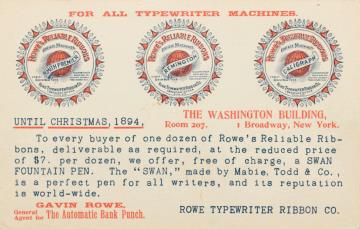 Werbepostkarte; Grafik, polychrom Rückseite: Werbetext für Schreibmaschinen-Schreibband Rowe Vorderseite: adressiert an A. J. Blake; vorgedruckte Briefmarke U. S. Postage one Cent; Poststempel New York