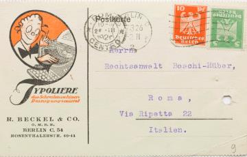Postkarte mit Werbebild; Grafik, polychrom Vorderseite: adressiert an Rechtsanwalt Boschi-Hüber, Roma; Briefmarke Deutsches Reich 10 Pf.; Poststempel Berlin, Roma/29 III 1926 Rückseite: beschrieben, datiert 27.3.26