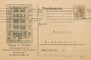 Werbepostkarte; Grafik, monochrom Vorderseite: adressiert an Herrn Schütz, Düsseldorf; Briefmarke Deutsches Reich 3 Pf.; Poststempel Hamburg/ 4 8.1917 Rückseite: vorgedruckter Text; datiert 4. August 1917
