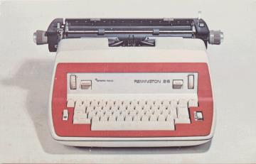 Illustrierte Postkarte; Fotocollage, polychrom Rückseite: Schreibmaschinen Remington, Kosmopolit (im Beschreibungstext: Hamonia), Mignon, Hammond; Vorderseite: beschrieben und adressiert; Briefmarke Deutsche Bundespost 50 Pf., Poststempel Ostheim/26.2.1982