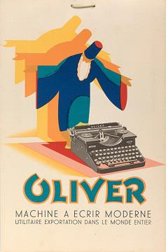 Werbeschild für Schreibmaschine Oliver; polychrom mit Klarsichthülle und Kordel zur Aufhängung Rückseite mit handschriftlichem Vermerk: 1944