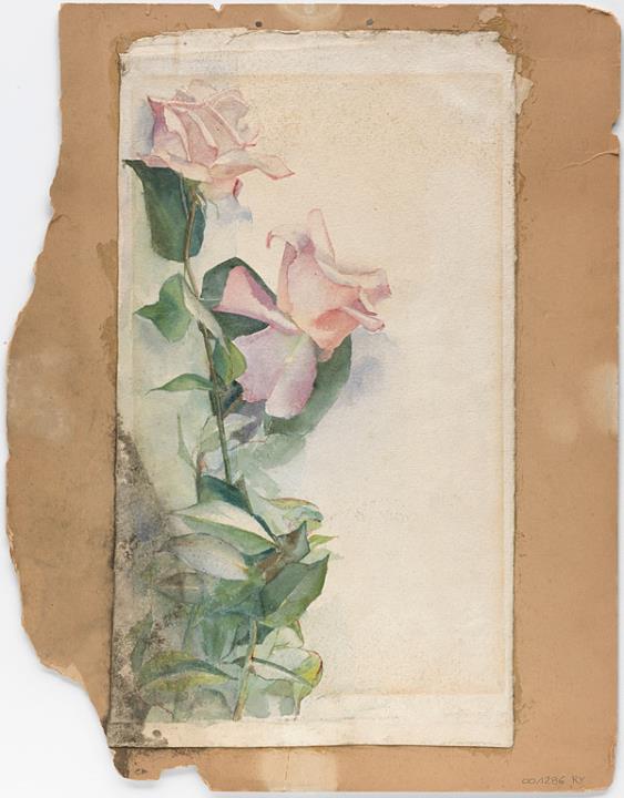 Werbeschild aus Pappkarton für Schreibmaschine Densmore (ursprünglich mit Abreißkalender); polychrom Rückseite: aufgeklebtes Blatt Papier mit Aquarell (Rosenmotiv)